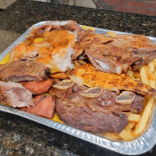 Parrillada Mixta is a hearty barbecue mix featuring chicken, pork ribs, beef ribs, chorizo, pork steak, and grilled chicken breast. Served with rice and fries, this flavorful combo delivers bold, smoky taste in every bite — perfect for sharing or enjoying as a feast.